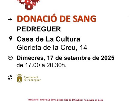 La campanya de donació de sang del mes de setembre serà el proper dimecres, dia 17 de setembre, des de les 17:00 hores fins a les 20:30 hores a la Casa de la Cultura.