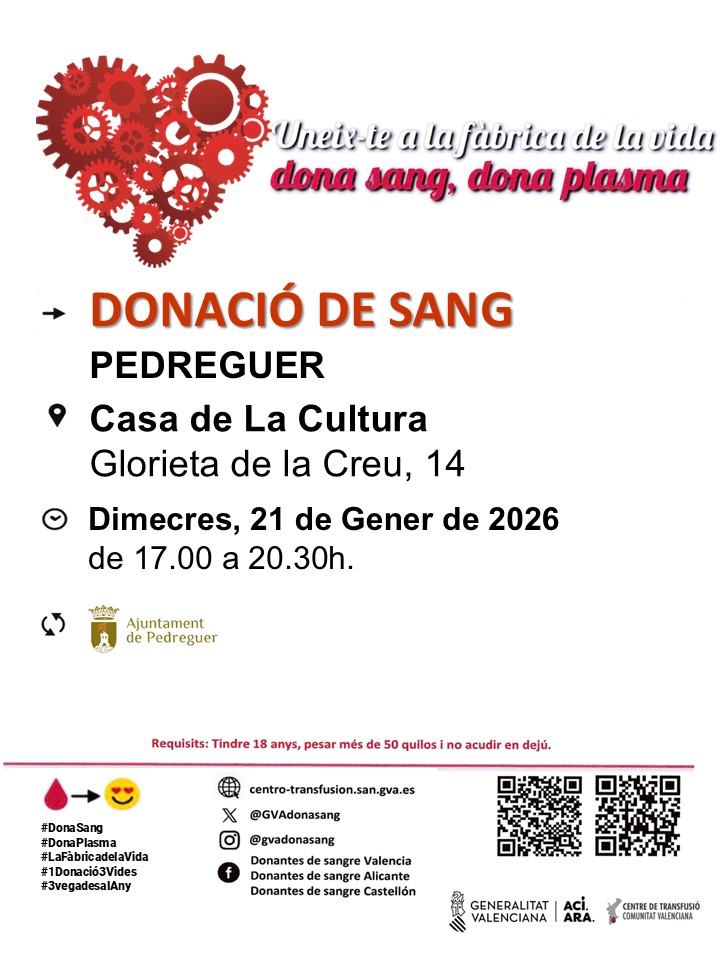 La campanya de donació de sang del mes de gener serà el proper dimecres, dia 21 de gener, des de les 17:00 hores fins a les 20:30 hores a la Casa de la Cultura.