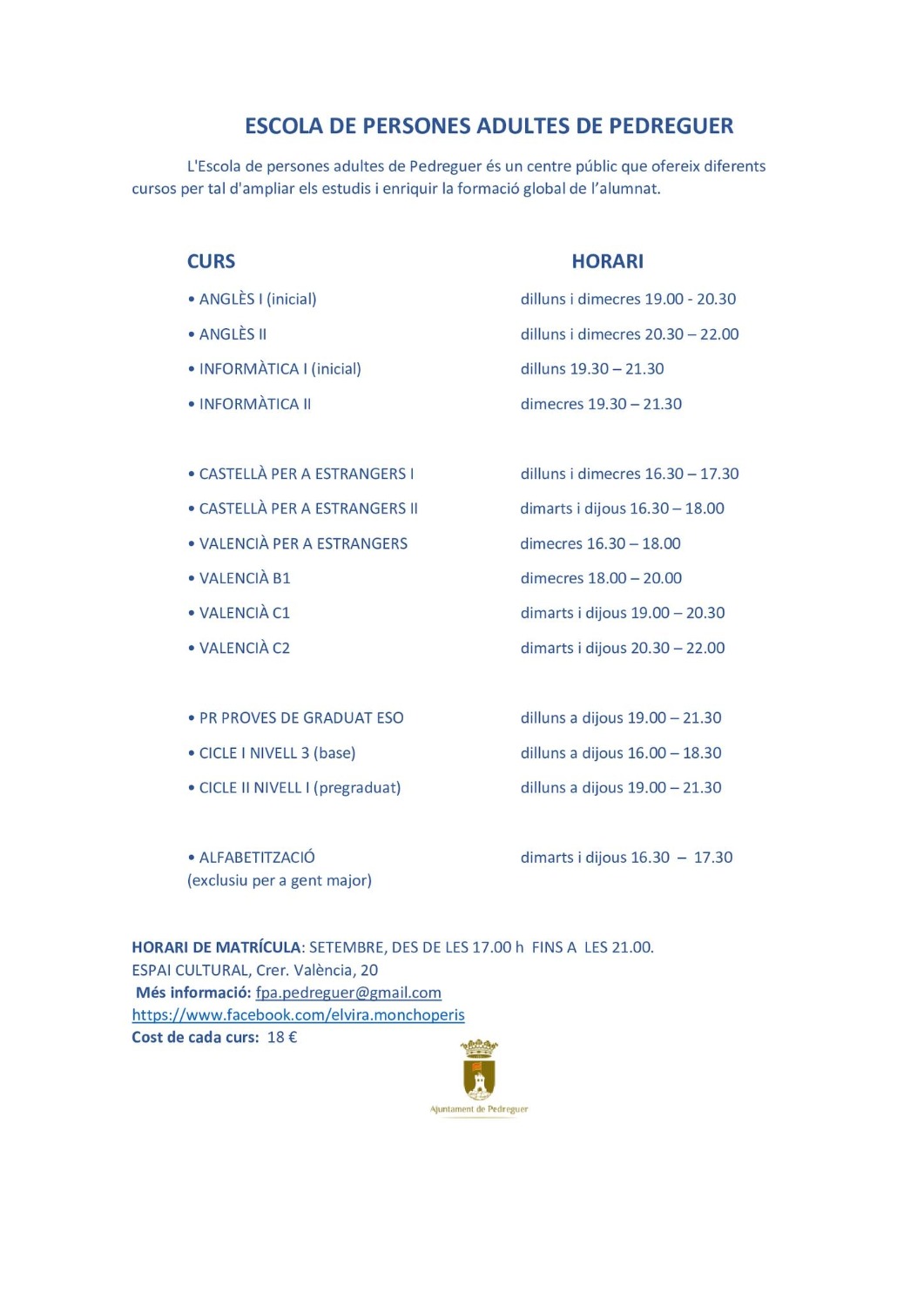 La Escuela de personas adultas de Pedreguer es un centro público que ofrece diferentes cursos para ampliar sus estudios y enriquecer la formación global del alumnado.