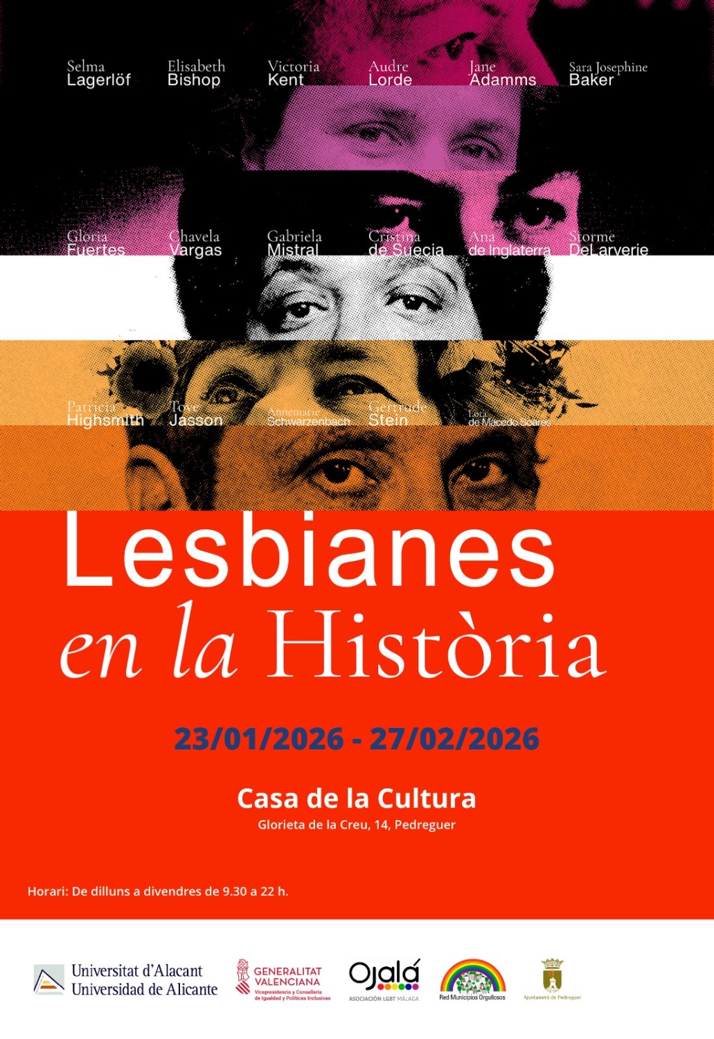 La Casa de la Cultura de Pedreguer acollirà, del dilluns 26 de gener al 23 de febrer, l’exposició “Dones lesbianes a la història”, impulsada per la Universitat d’Alacant i que arriba al municipi amb la col·laboració de l’Ajuntament de Pedreguer.